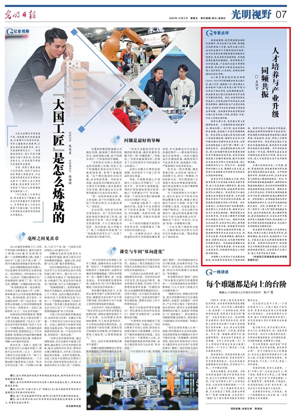 12月5日,《光明日报》“光明视野”版刊发我校党委书记左同宇署名文章《人才培养与产业升级同频共振》。文章立足制造强国、教育强国建设的时代背景,深入阐释了职业教育在培养大国工匠、服务新质生产力发展中的核心使命与实践路径。