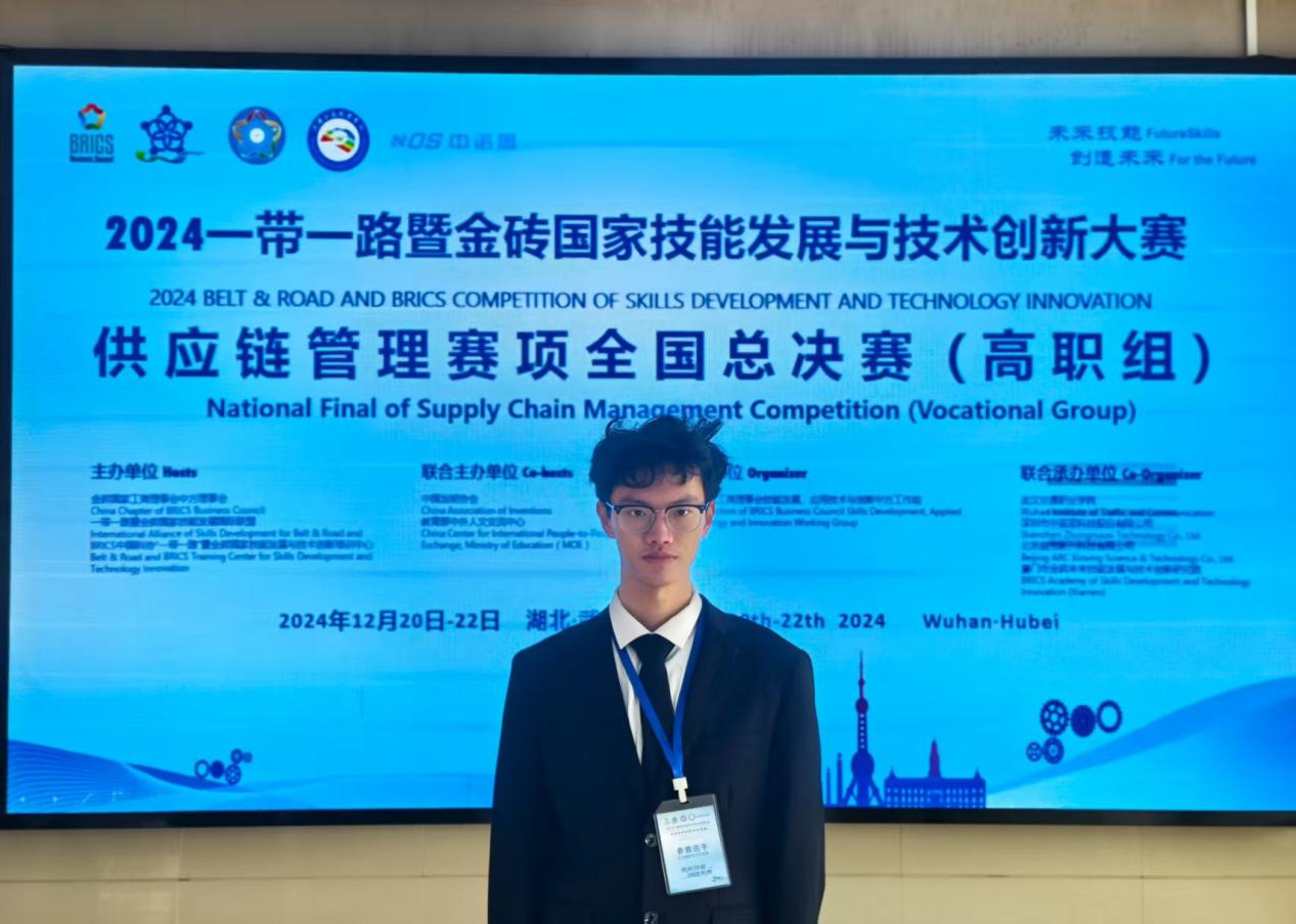 省赛现场,面对30多支队伍的角逐,他和队友凭借几乎零失误的系统操作,拿下江苏省职业院校技能竞赛供应链管理赛项一等奖。紧接着,他冲击“一带一路暨金砖国家技能发展与技术创新大赛”:先摘得省级一等奖,再在全国赛场拿下国家三等奖。