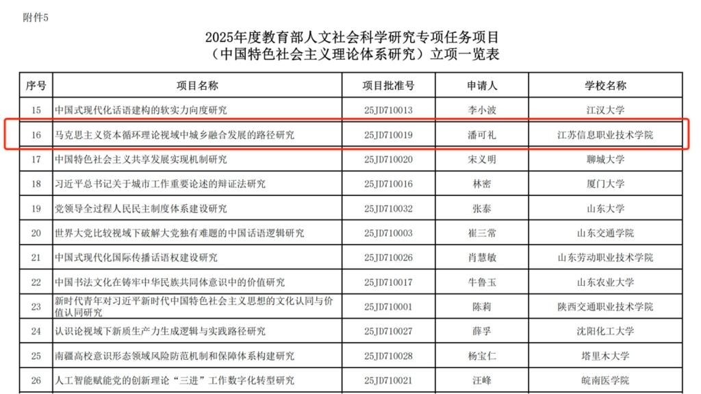 近日,教育部社会科学司正式公布了2025年度教育部人文社会科学研究专项任务项目(中国特色社会主义理论体系研究)立项结果。马克思主义学院潘可礼教授主持申报的课题“马克思主义资本循环理论视域中城乡融合发展的路径研究”(25JD710019)成功获批立项。据了解,教育部人文社会科学研究专项任务项目(中国特色社会主义理论体系研究)旨在鼓励高校社科工作者围绕中国特色社会主义重大理论与实践问题开展深入探索,产出具有理论...